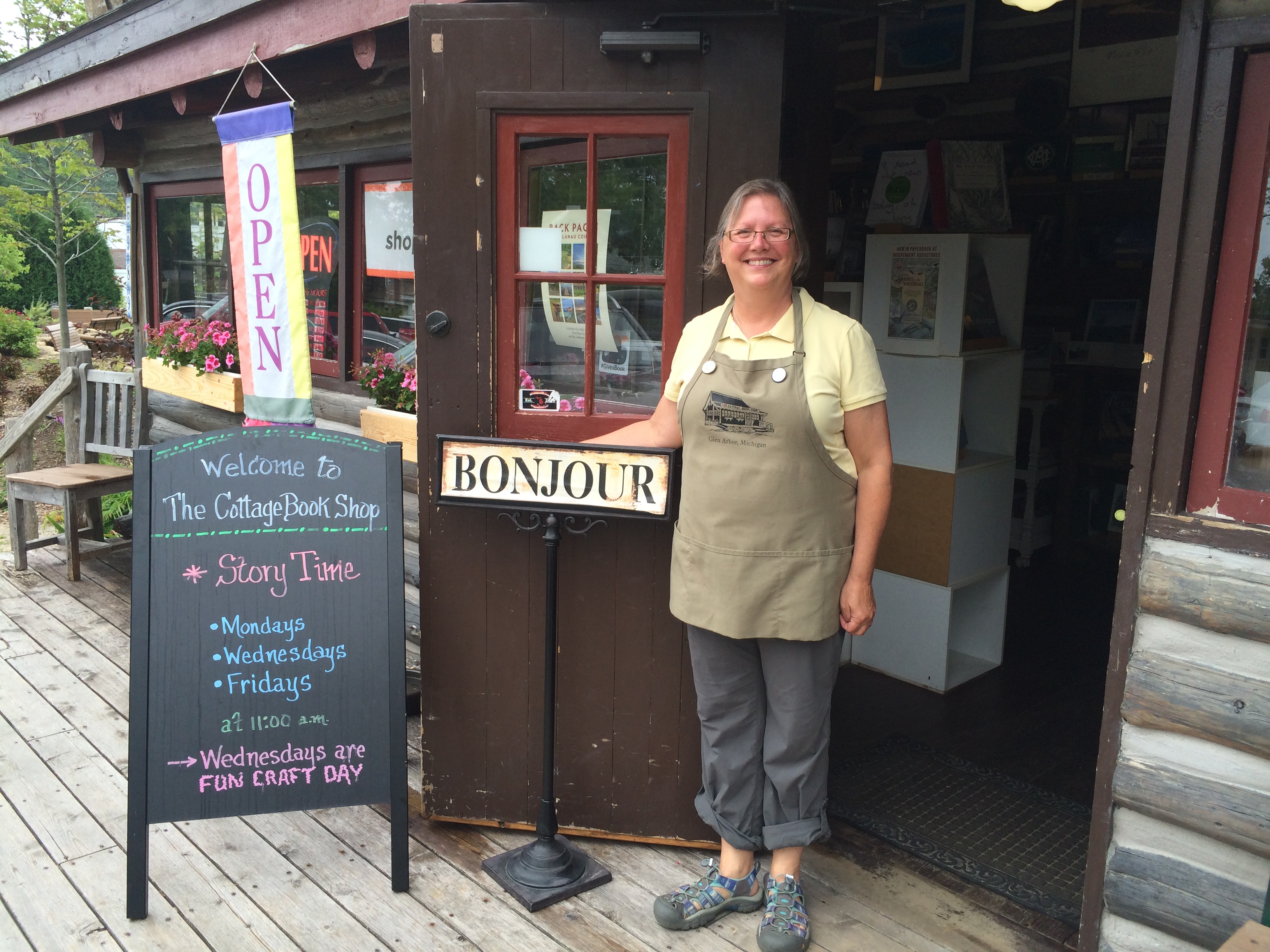 “I never thought I’d fall in love with another bookstore,” Sue said, but fall in love she did — with one of the most charming bookstores I’ve ever seen, the Cottage Book Shop in Glen Arbor, Michigan. Housed in a log cabin that was built in 1920 and moved from its original location to its current one in 1998, the shop is packed with a wide assortment of carefully chosen books — plus puzzles, games,toys, and cards. The walls are covered with the work of local artists. Sue bought the store in the spring of 2014 from longtime owner Barbara Siepker, who was planning to retire. (Her vision of retirement apparently didn’t involve running a small business!)